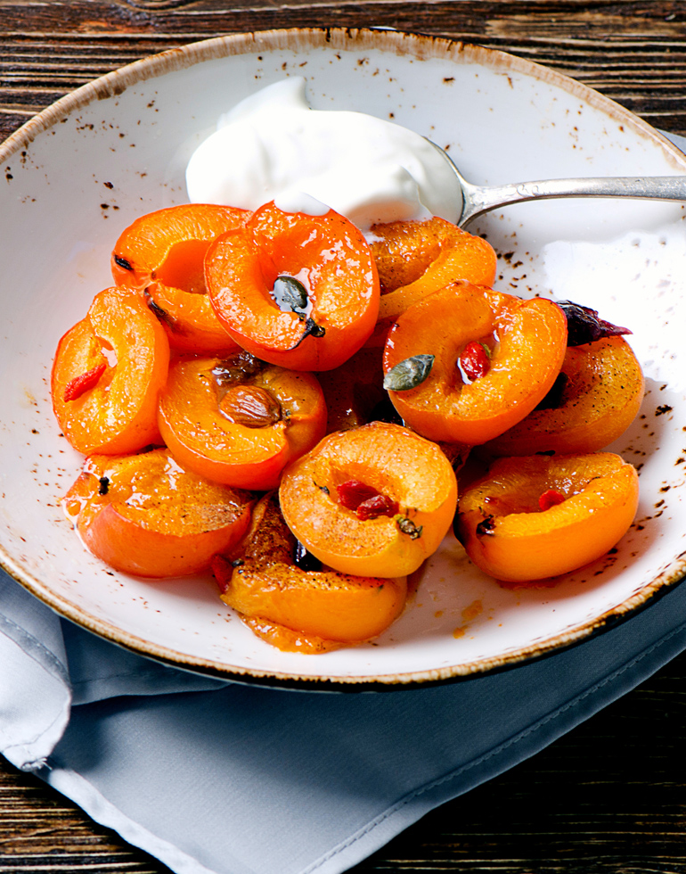 Albicocche alla vaniglia, chiodi di garofano e crema bianca