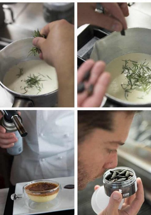 Metti gli aghi di rosmarino nel latte e panna che avrai versato in un pentolino, aggiungi le fave tonka spezzate a metà e porta a cottura a 70 – 80°C.