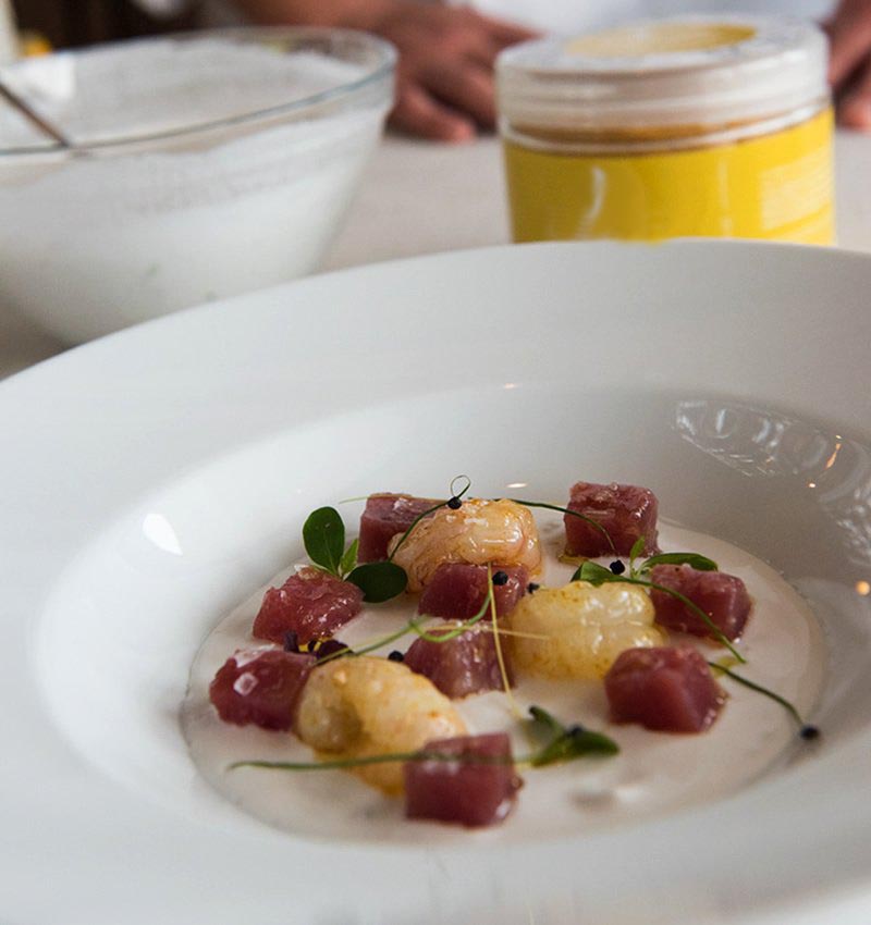 Inizia la mattina immersa negli aromi e nei profumi della cucina. Lo chef ci prepara per primo un Tonno al latte di cocco con crudo di scampi al curry English JS 1599. Un piatto semplicissimo, che non ha bisogno di fornelli ma soltanto di un’ottima marinatura.
