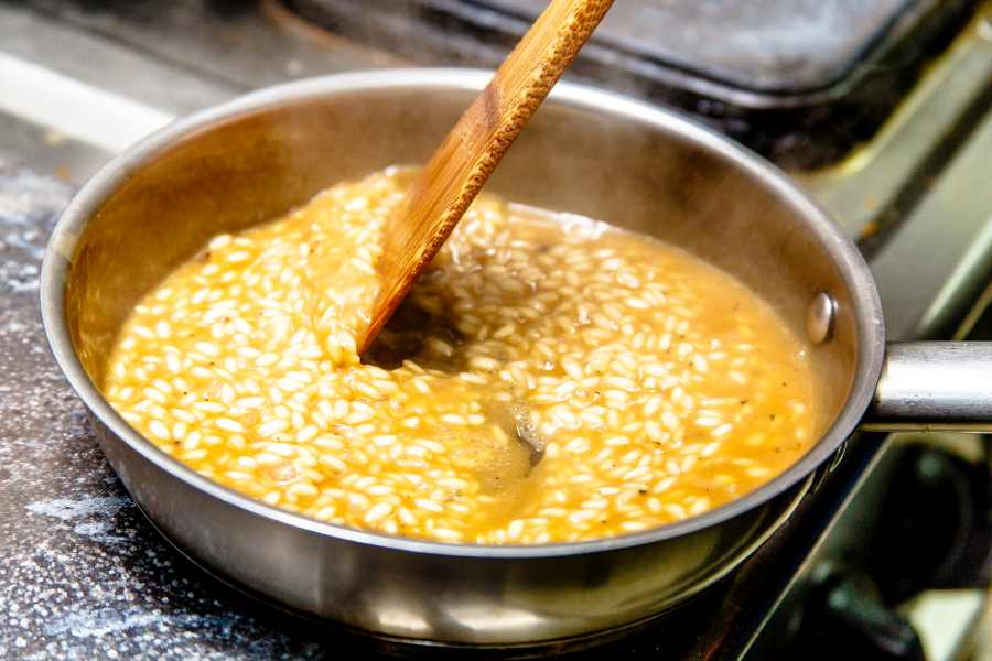 Andate avanti ad aggiungere brodo vegetale man mano che il precedente viene assorbito. Mescolate spesso il risotto, con delicatezza.