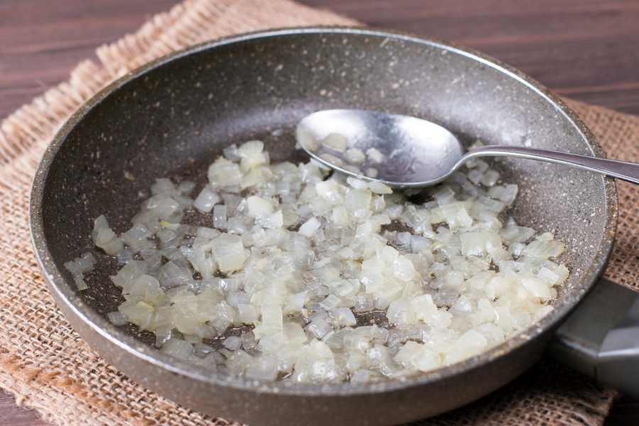 In una padella (va bene anche antiaderente) fate stufare mezza cipolla bianca o rossa, tagliata a piccoli pezzettini, con l’ausilio di olio evo. Fermatevi quando le cipolle appariranno traslucide. Tenete da parte.