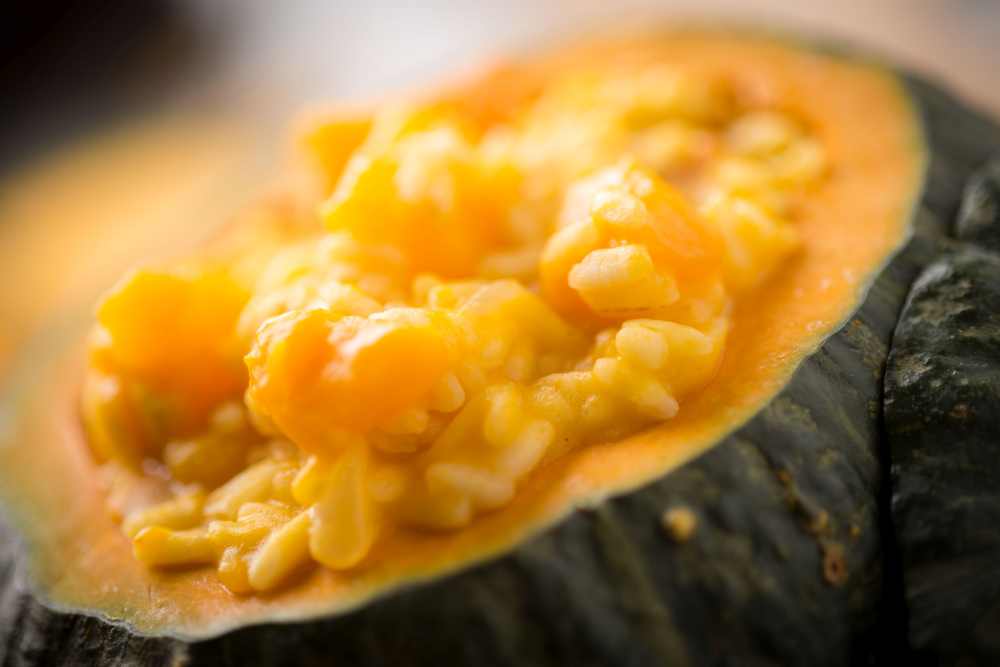 Cuocete il risotto per 15/18 minuti, seguendo le indicazioni riportate sulla confezione. Un attimo prima di raggiungere la cottura al dente, aggiungete la purea di zucca e continuate a mescolare con delicatezza, ma con attenzione, affinchè tutto il riso sia pregno della crema.