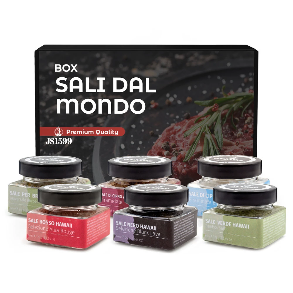 Box di sali selezionati provenienti dal mondo, 6 vasi vetro gourmet che ti daranno la possibilità di aromatizzare pietanze di ogni tipo. Sale verde, nero e rosso proveniente dalle Hawaii, sale piramidale bianco e piramidale affumicato di Cipro, e sale per brace e bbq.