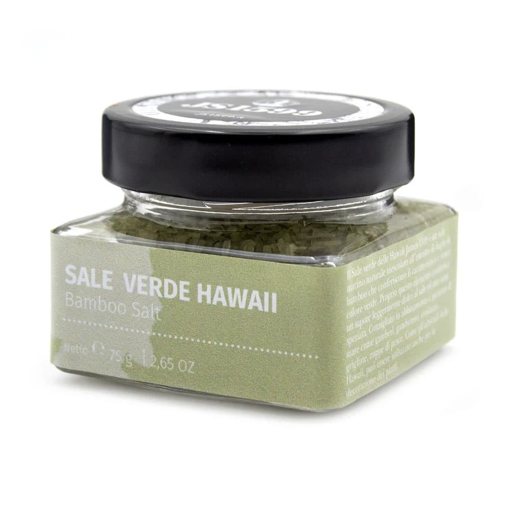 Sale Verde delle Hawaii: Il Sale verde delle Hawaii JS1599 è un sale marino naturale mescolato all’estratto di foglie di bamboo che conferiscono il caratteristico e vivace colore verde. Proprio questo elemento conferisce un sapore leggermente dolce al sale ed una nota speziata. Consigliato in abbinamento a pietanze di mare come gamberi, gamberoni, crostacei, grigliate, zuppe di pesce. Come gli altri sali delle Hawaii, può essere utilizzato anche per la decorazione dei piatti.