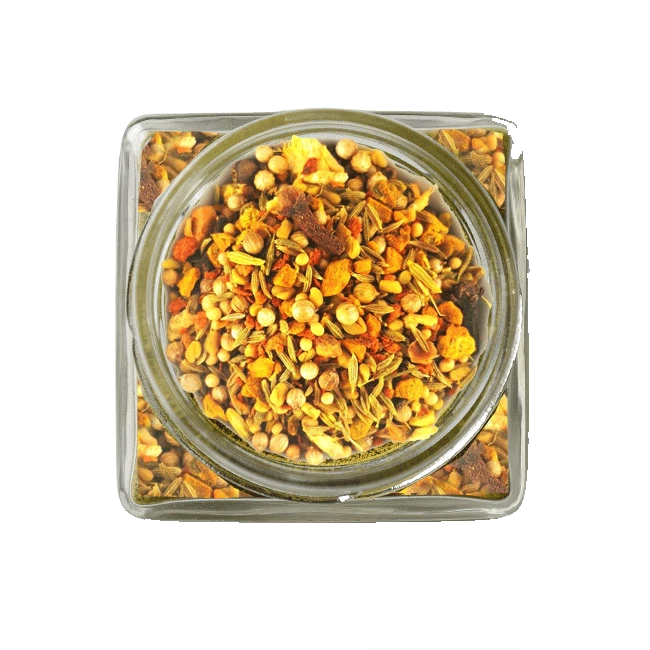 Ingredienti: Coriandolo, curcuma, cumino, zenzero, galanga, semi di finocchio, chiodi di garofano, pimento pepe garofanato, senape, fieno greco, peperoncino, semi di cumino, semi di kummel