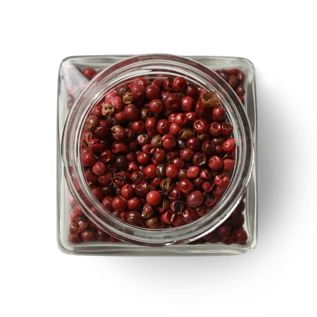 Suggeriamo di provare il pepe rosa in un’insalata di arance e cipolle o in un’insalata calda di formaggio di capra. Il pepe rosa è altamente resinoso, quindi è sconsigliato utilizzarlo in un macinapepe.