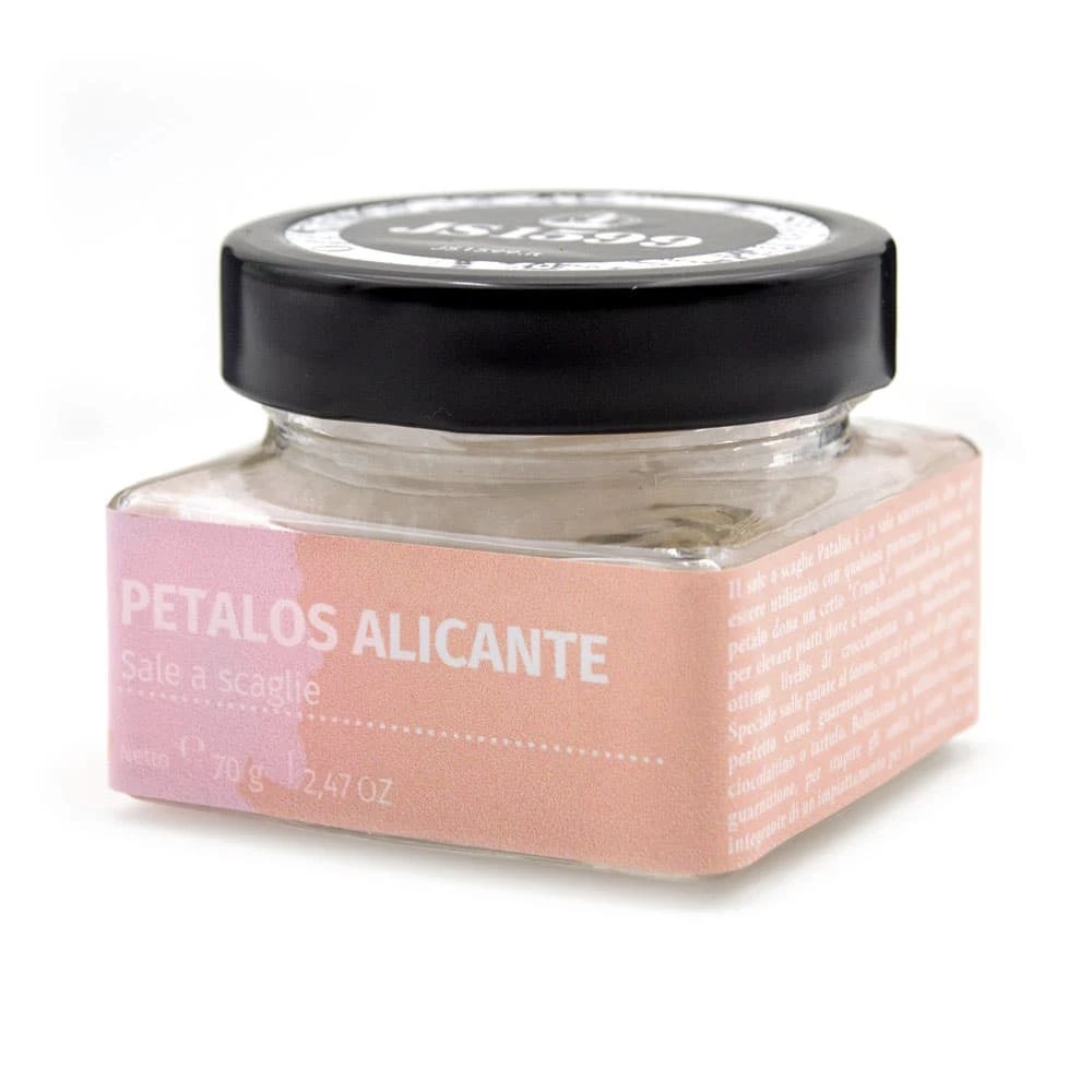 Il sale denominato petalos è costituito da cristalli in scaglie naturali al 100% , che nascono nelle Salinas de Villena , dove si trova una sorgente sotterranea di acqua salata. Non contengono sbiancanti o additivi, mantenendo tutti i minerali e gli oligoelementi originali, il che rende il prodotto un’opzione di alta qualità .