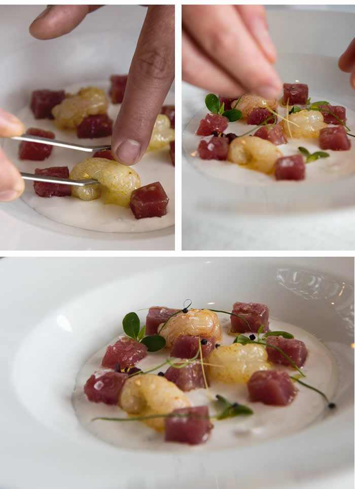 Passiamo all’impiattamento: si mette alla base il latte di cocco aromatizzato. Si dispongono i tocchetti di tonno, gli scampi, i germogli freschi misti e qualche fiocco di sale.